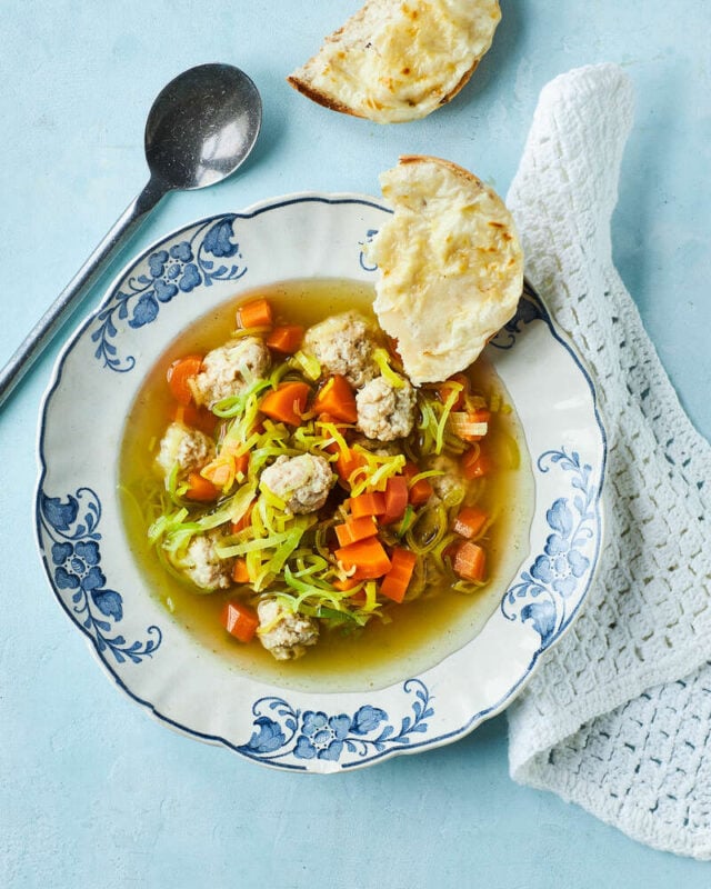 Hønsekødssuppe med hjemmelavede kødboller og ostebrød