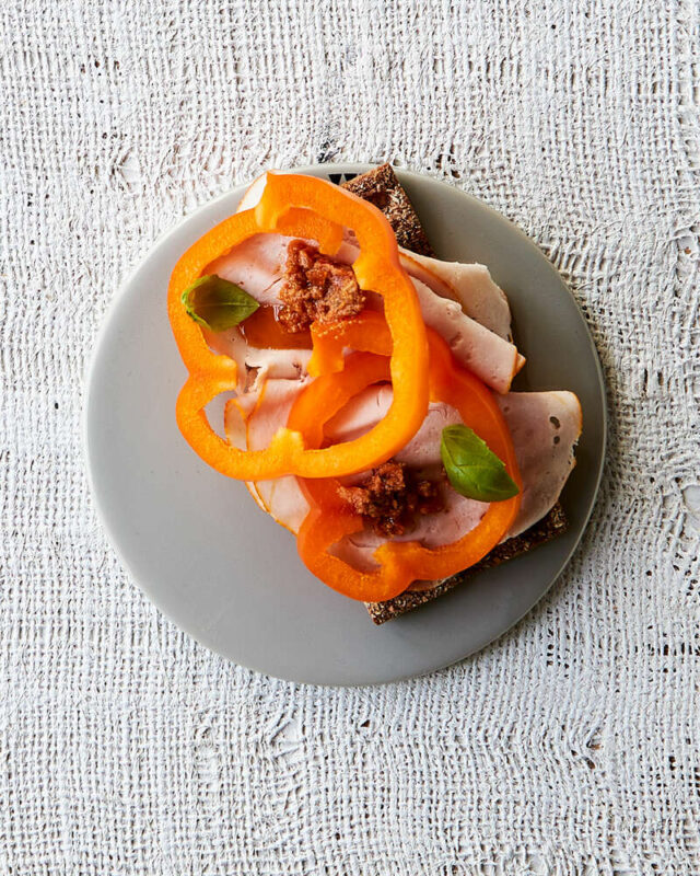 Knækbrød med kødpålæg, pesto og peberfrugt
