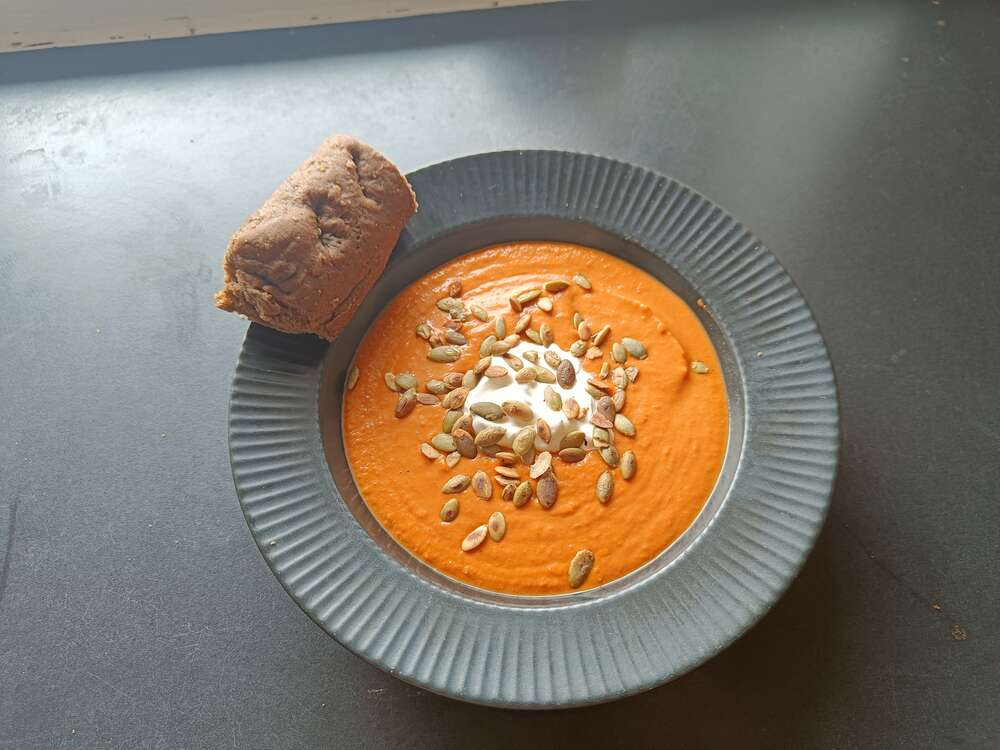 Cremet tomatsuppe med røde linser og sprøde kerner