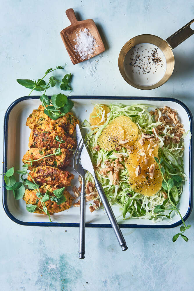 Grønne frikadeller med appelsinsalat