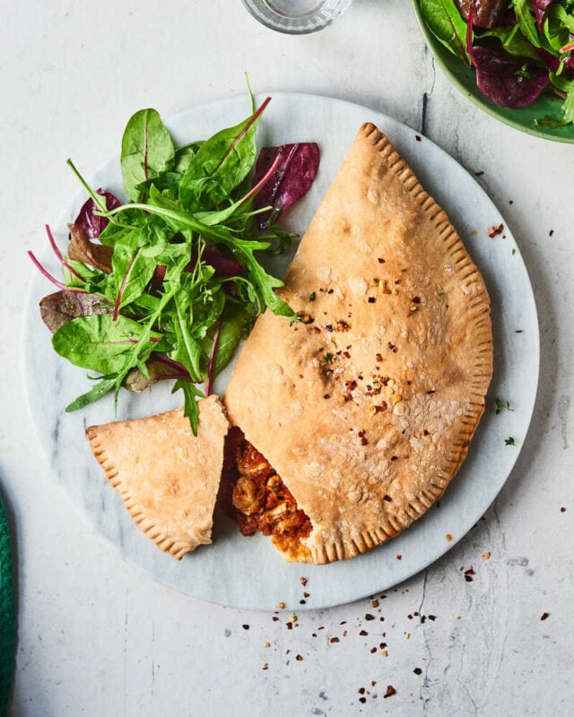 Indbagt kyllingepizza med salat til