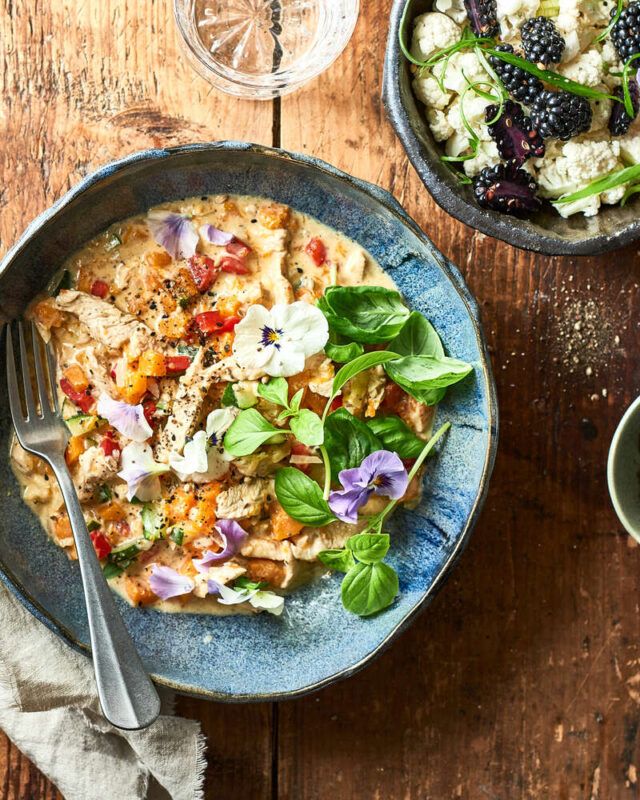 Kyllingegryde med butternut-squash dertil blomkåls-brombærsalat