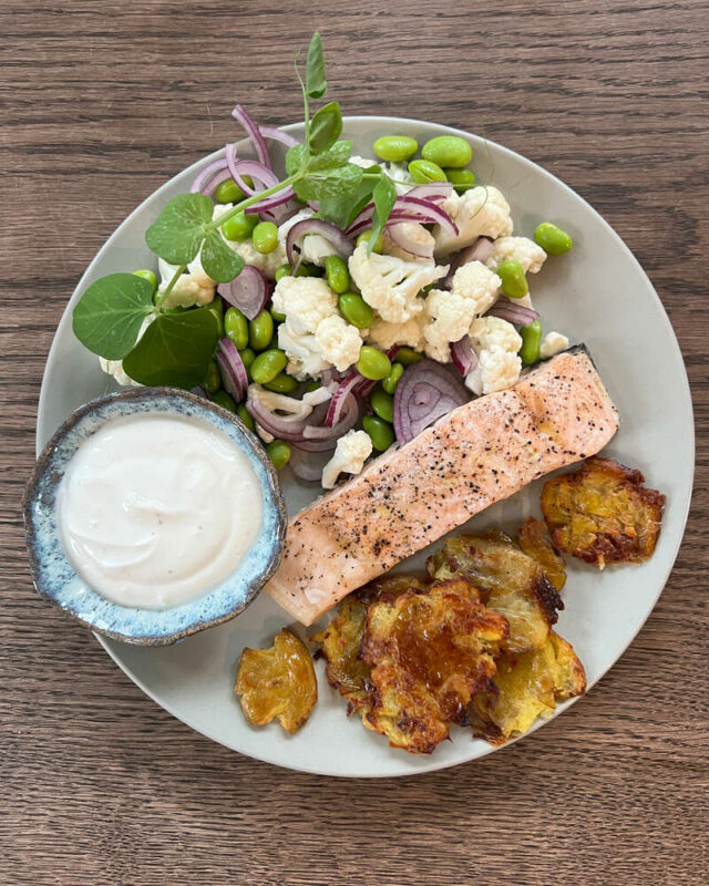 Ovnbagt laks med knuste sprøde kartofler og blomkålssalat