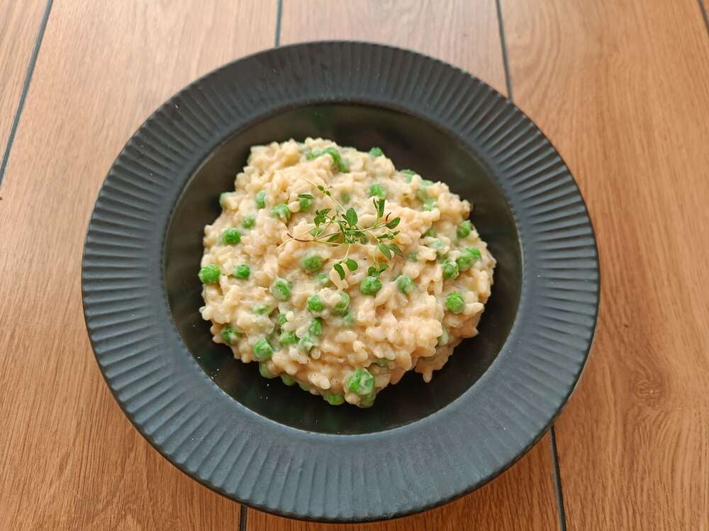 Cremet risotto med ærter og hvide bønner, der giver en fyldig konsistens og masser af smag. En nem vegetarisk ret, perfekt til både hverdag og weekend.