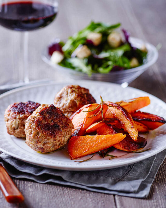 Sønderjyske frikadeller med sød kartoffelfritter