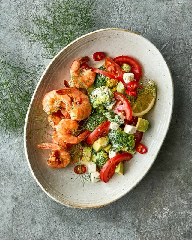 Stegte tigerrejer med broccoli-tomatsalat