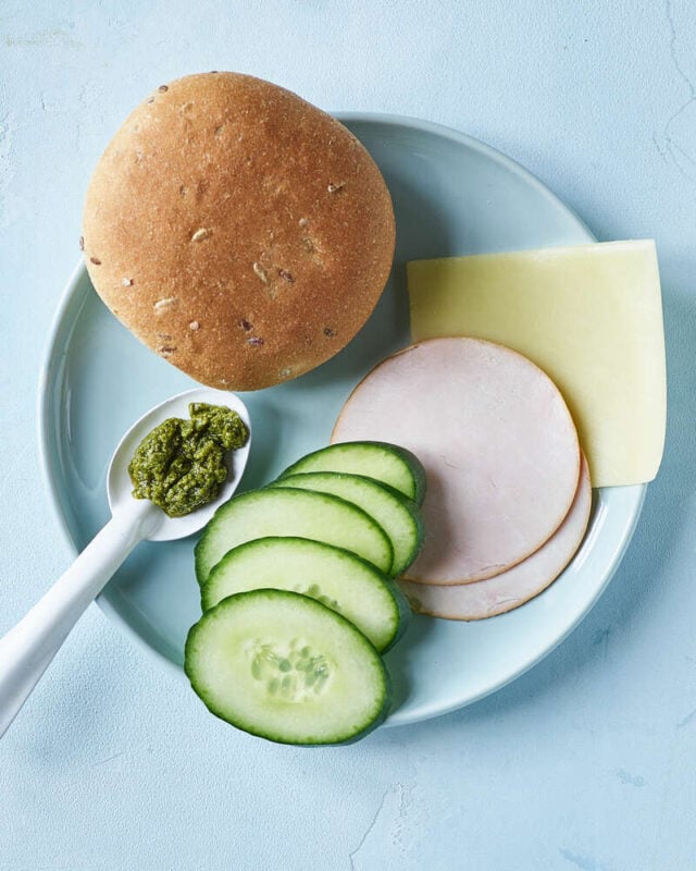 Fuldkornsbolle med hamburgerryg, ost og pesto