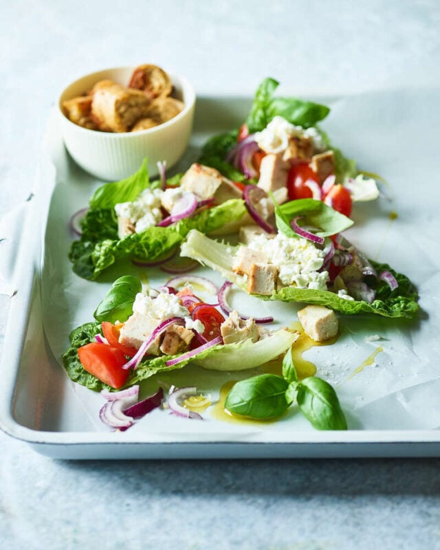 Hjertesalat med kylling og hytteost serveret med sprødt brød