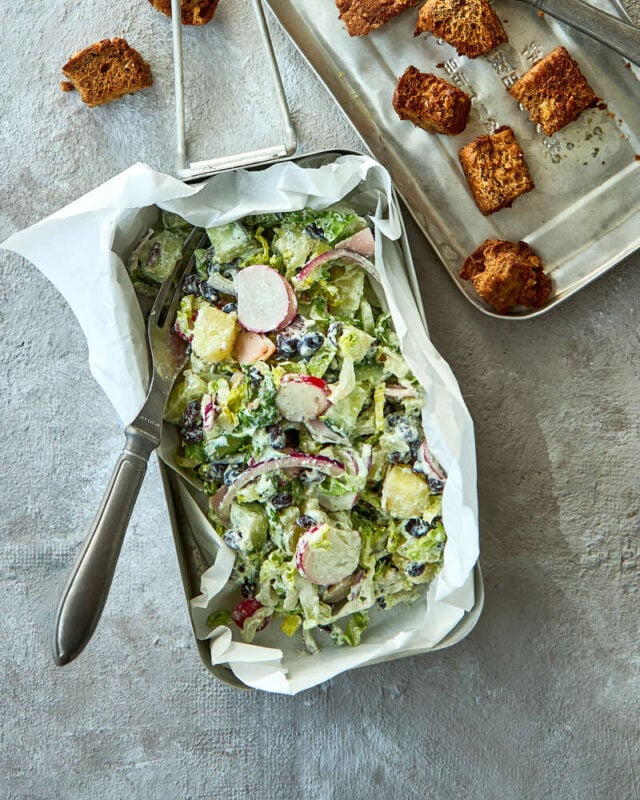 Madpakkesalat med persilledressing og hvidløgscroutoner