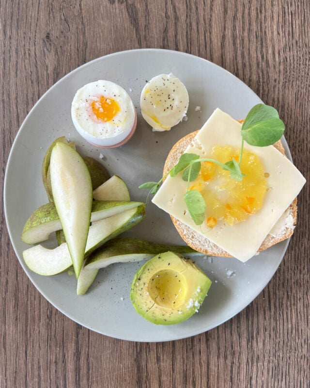Morgentallerken med æg, rundstykke med ost, frugt og grønt