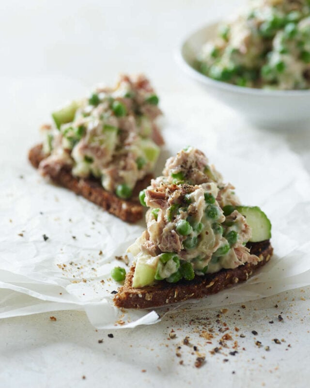Tunsalat med ærter og agurk på rugbrød
