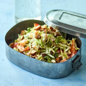 Denne kålsalat med spidskål, valnødder, granatæble og vindruer er en dejlig kombination af sprødhed, syre og sødme, der giver et forfriskende modspil til dit julemåltid. Kålsalaten passer perfekt som ledsager til flæskestegen, andestegen eller gåsen juleaften, men den vil også være et lækkert og let indslag på bordet til årets julefrokoster, hvor den er en flot og farverig tilføjelse, som både pynter og vækker appetit blandt deltagerne.
